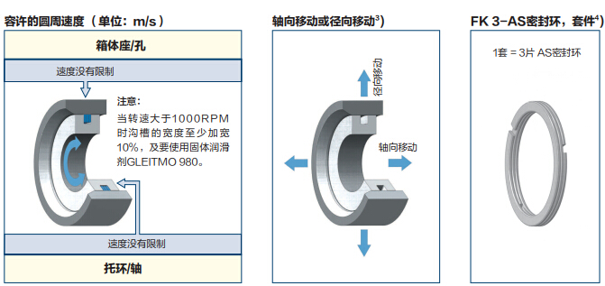 用于滾動及滑動軸承的油脂密封,如果抹上油脂,它能防止灰塵的侵入及環(huán)境濕度的影響。組合套件“FK 3-ASK” (增加溝槽底部的密封)由于迷宮的回路增加其密封效果也增加了。