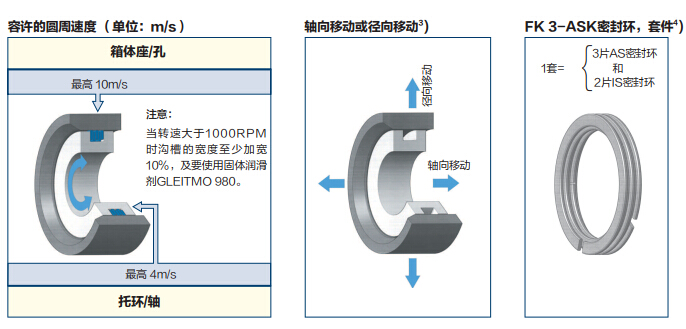 用于滾動及滑動軸承的油脂密封,如果抹上油脂,它能防止灰塵的侵入及環(huán)境濕度的影響。組合套件“FK 3-ASK”(增加溝槽底部的密封)由于迷宮的回路增加其密封效果也增加了。